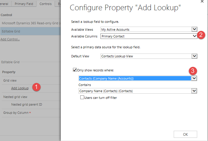- Navigate back to your solution and click Add Lookup and now we can configure lookup filtering, as we can do it on entity form. We can also change the view, which we want to show in lookup Window.