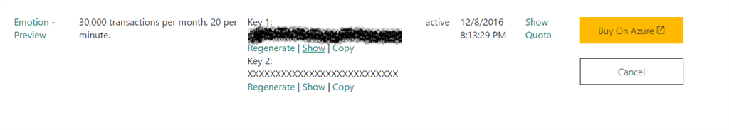 Before coding, copy the Emotion API key from Cognitive Service official site. It’s a free account. You will be able to get two keys, as shown below. Click here to get Emotion API key.