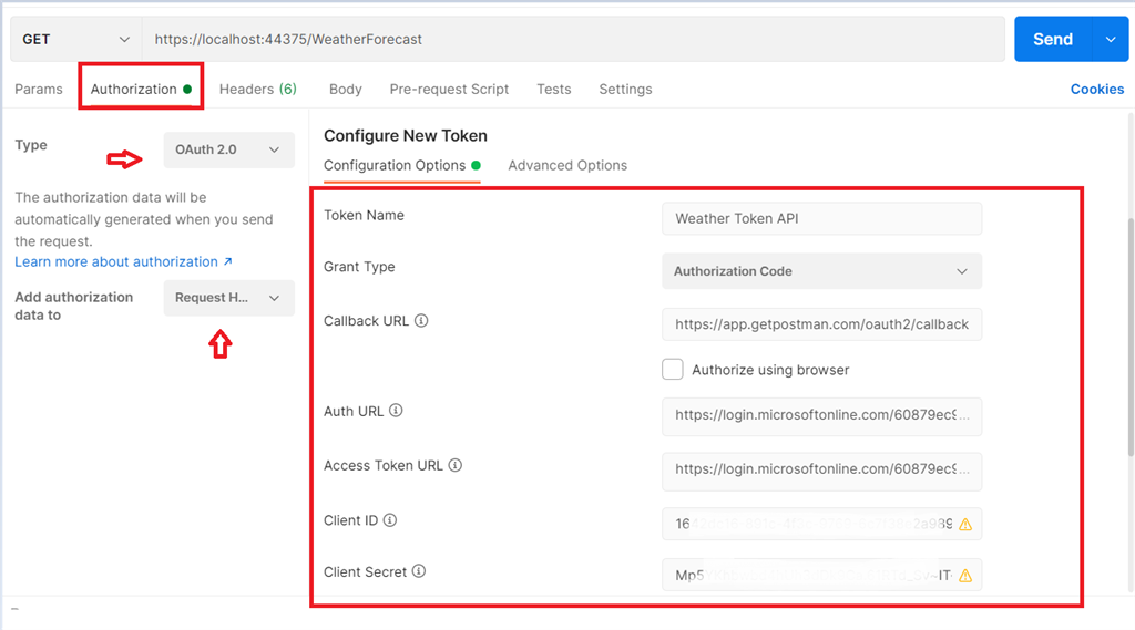 We have completed the configuration for connecting the client using Postman. Now open Postman, provide the URL - https://localhost:*****/WeatherForecast, then select the Authorization tab and choose OAuth 2 from the Type list and choose Request Headers in Add authorization data to the Values for Authorization in Postman.