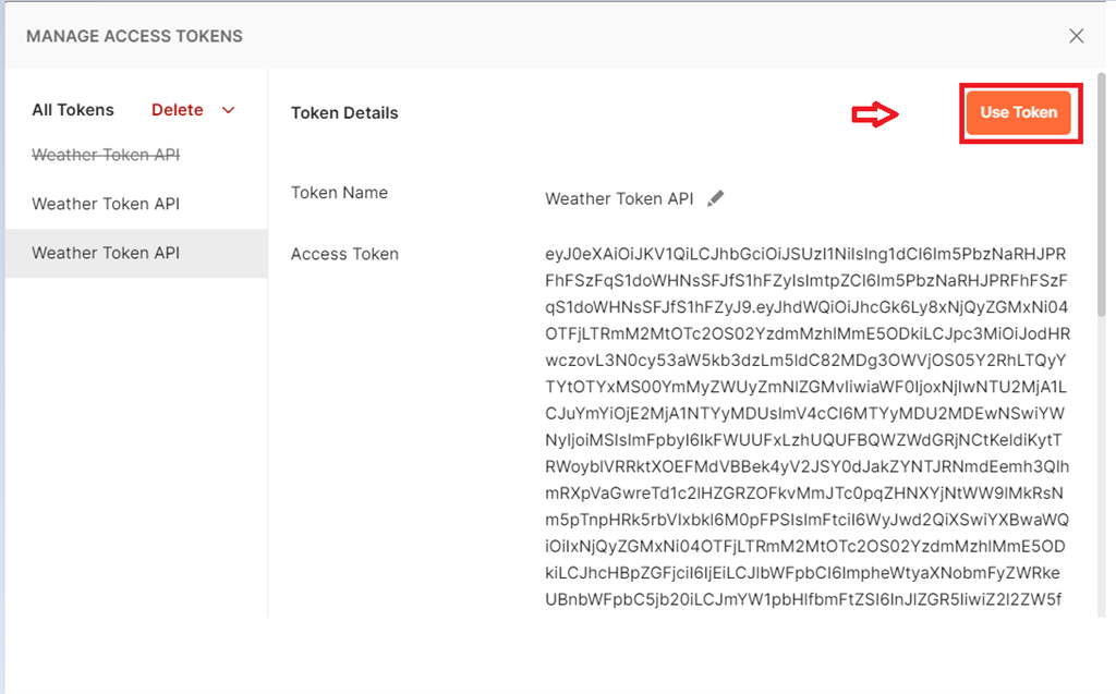 Below is the token generated by authenticating with our credentials click on > Use Token > it will automatically add in the request header.