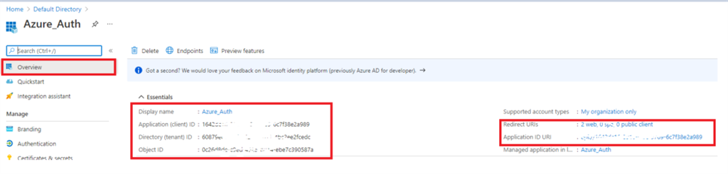 When the app registration is complete we can see the Client Id and Tenant Id in the Azure overview and copy those ID'd we will need in configuration setup.