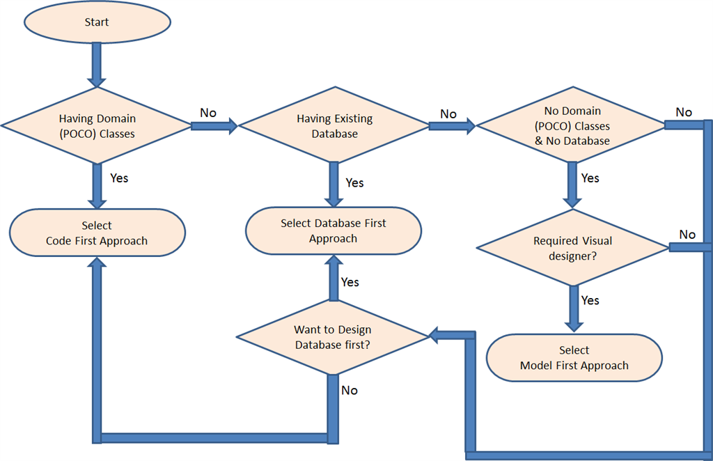 Definitely, the development approach depends upon the project situation. The following diagram may help us to select the correct approach for your project. As in this diagram, if we already have domain classes, the Code First approach is best suited for our application. The same as if we have a database, Database First is a good option. If we don't have model classes and a database and require a visual entity designer tool then Model First is best suited.