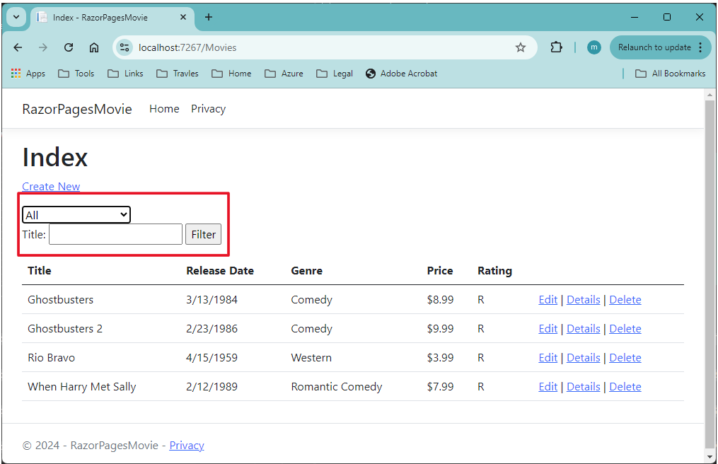 Open the Pages/Movies/Index.cshtml file, and add the markup highlighted in the following code: