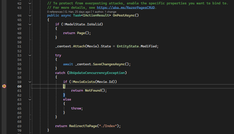 Review the OnPostAsync method in the Pages/Movies/Edit.cshtml.cs file: