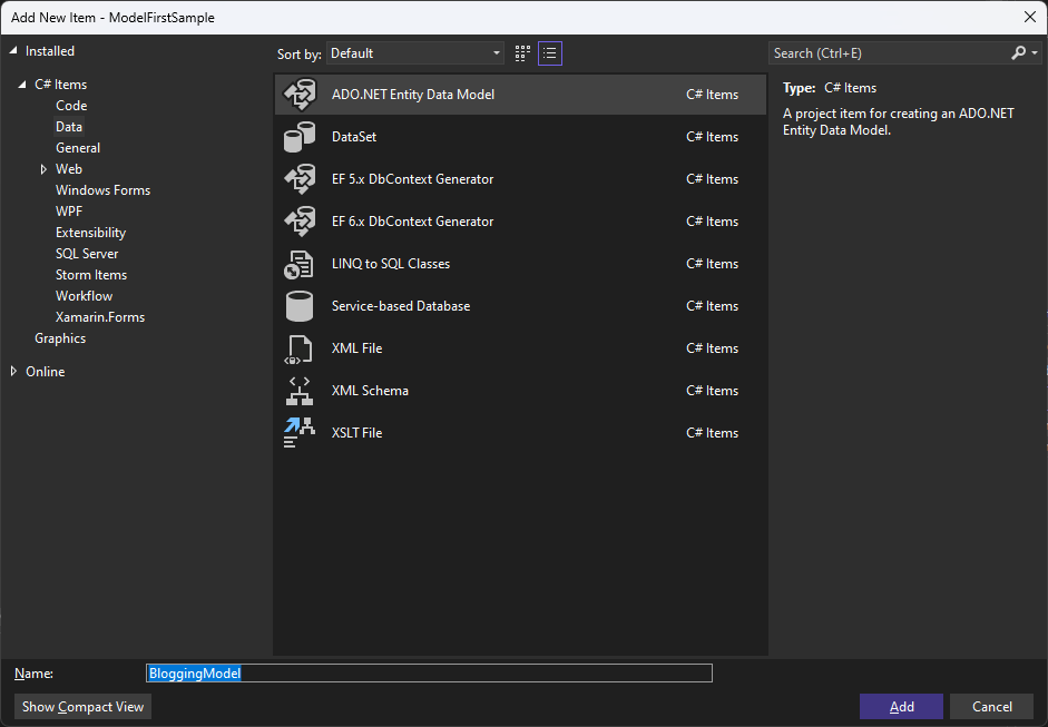 That is true, online there is few Model First approach sample, the one I can found is a article from Microsoft, Model First - EF6 | Microsoft Learn, puclished in 2020, and actually discussing about Visual Studio 2010 --- that is a old version. Because I did not find the other version of Model First Approach sample, I just follow this sample, starting from here, then figure out the difference between Model First Model and others, such like code first approach. This is a console module, so I just make console app.
