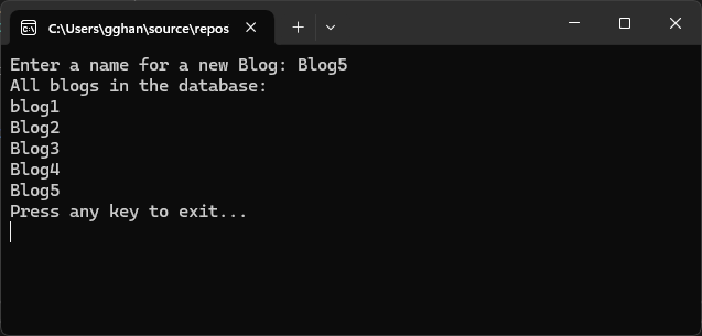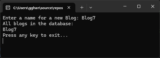 Implement the Main method in Program.cs as shown below. This code creates a new instance of our context and then uses it to insert a new Blog. Then it uses a LINQ query to retrieve all Blogs from the database ordered alphabetically by Title.
