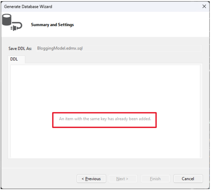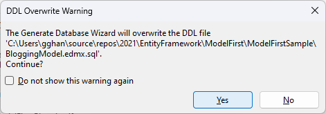 - You may receive warnings about overwriting the existing DDL script and the mapping and storage parts of the model, click Yes for both these warnings