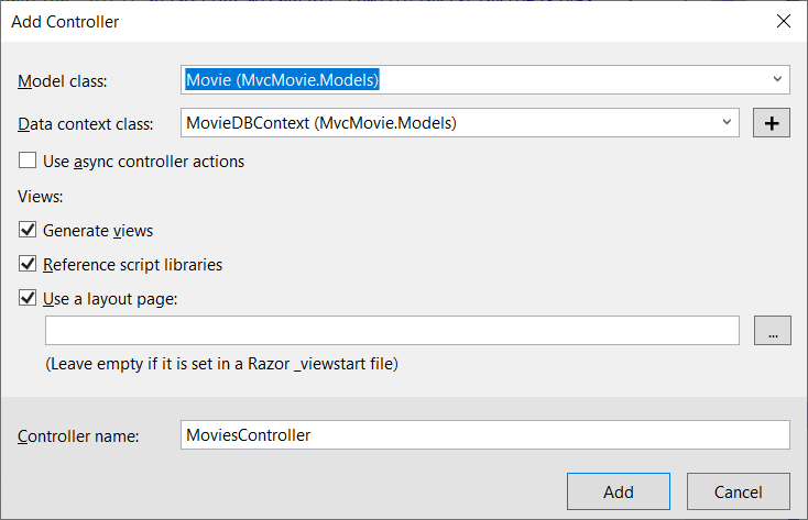 - Select MovieDBContext (MvcMovie.Models) for the Data context class.