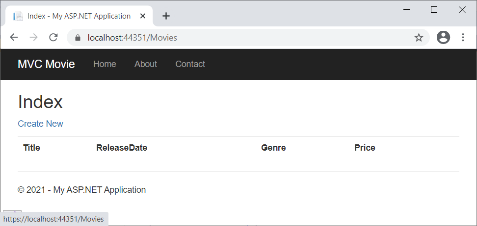 Select the Create New link. Enter some details about a movie and then click the Create button.