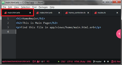 - Now we going to create our main page (main.html.erb) template in app>>views>>home folder. Open that folder now using the following code to create the file and then we will add some HTML tags.
