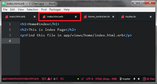 - The index page file is already created in our controller generation, you can use that file (index.html.erb) in view>>home folder. Open that folder now using the following code to create the file and add some HTML tags.