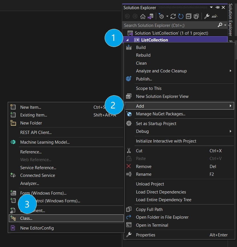 - Click on Solution Explorer -> Right Click on Project Name -> Goto Add -> Goto Class and click on it.