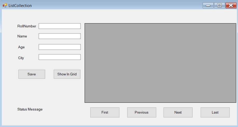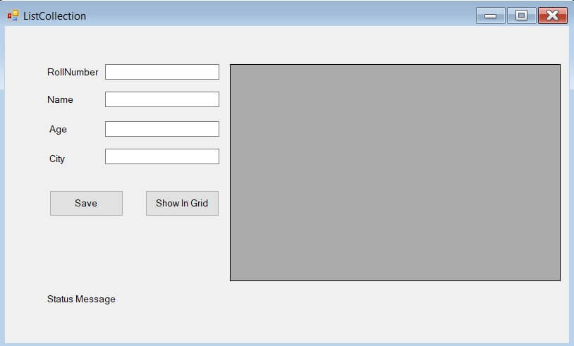 Now run your application enter Some Students Details Click on Save each time -> Click on Show In Grid to view students List values in Grid.