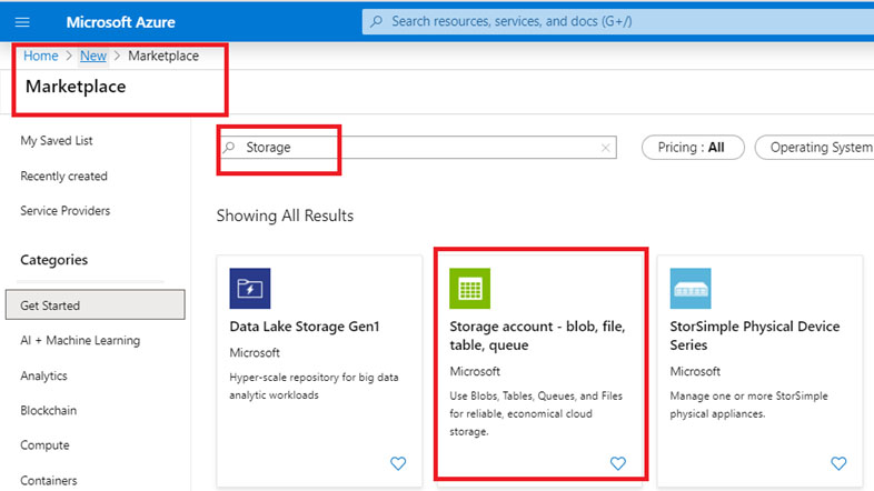 Go to Microsoft Azure Portal => Create a resource => type ‘Storage’ and select the one highlighted as shown in below image, and hit on ‘Create’