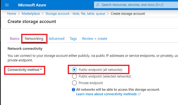 Make sure the connectivity method is opted as Public endpoint (all networks), as our goal is to have this storage as a public hosting option for a web page.