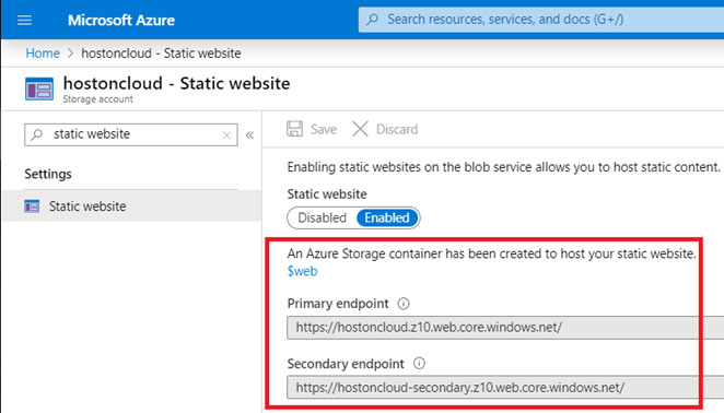 If you notice the above image carefully, along with the endpoints, it also says, that a container name ‘$web’ is created in the storage account.