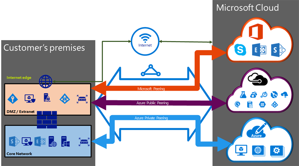 In the purple line, we see Azure public peering and this is the connectivity to Azure resources via their public IPs. And then, Azure private peering is connecting to the resources via their private IP address.