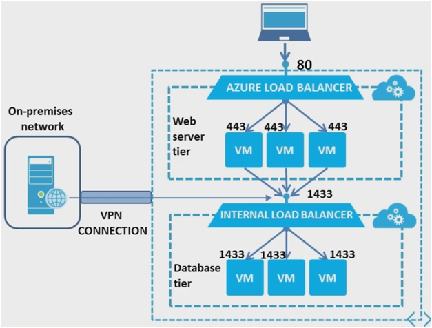 Azure load balancer is the Internet-facing load balancer. And then, we see the internal load balancer underneath that, which enhances the security because only the Internet traffic will see the Azure load balancer. So, that provides load balancing in that Internet-facing level. In this above figure, we see a Web Server tier, obviously that's facing the Internet. We are distributing the load across multiple virtual machines there. From that point, the internal load balancer is accessible to only those virtual machines, in the Web Server tier or through any kind of specific or dedicated VPN connection, for an organization’s own administrative purposes.