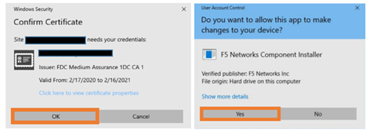 You may be prompted to allow F5 Networks Component Installed, click Yes:
