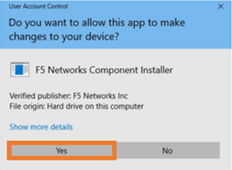You may be prompted to allow F5 Network Component Installer, click Yes: