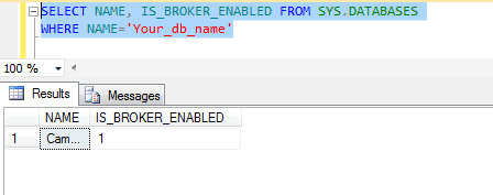 - SELECT NAME, IS_BROKER_ENABLED FROM SYS.DATABASES
