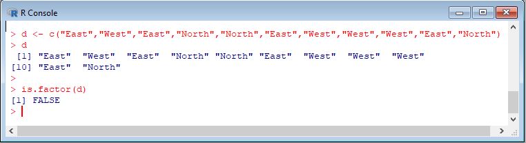 To check whether d is a factor or not, we use the is.factor() attribute, as shown below: