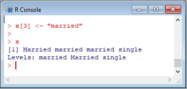 - > x[3] <- "divorced"