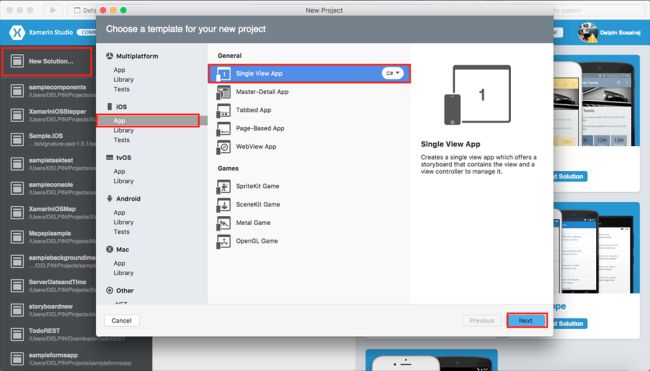 Click New Solution—> select iOS—>select an App--> Choose single View App. Afterwards, click Next.