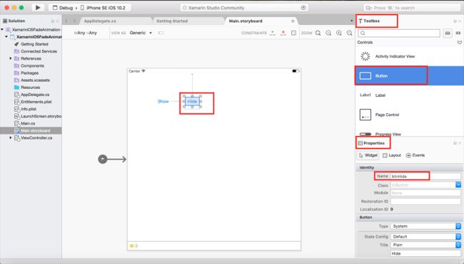 You need to align the button, using constraints.and go to the properties Window. Select the Button and give a name (Ex:btnHide).