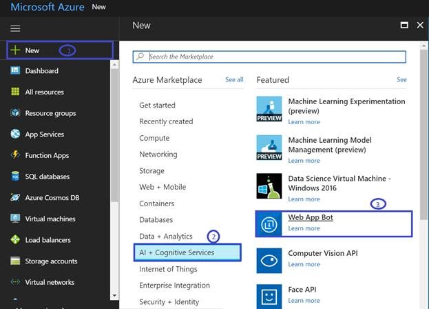 1. Click New -> AI + Cognitive Service -> Web App Bot