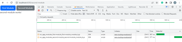 When we navigate the feature module, only its corresponding files will get loaded because we are lazy to load them with load children, as shown in the above image under the application console. Also, it improves performance when we have a big project with different complex modules.