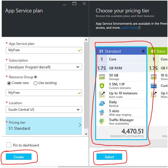 Please note that the App Service plan can be associated only with one Resource Group. And, while creating the App Service Plan, we need to select the “Pricing Tier.” Click on the “Pricing Tier” link of the above screen capture and select “S1 Standard” as shown below. You can select the pricing tier based on your requirements.