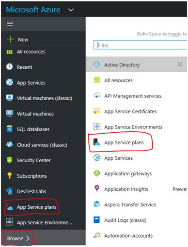 If you don’t see the “App Service Plans”, click on “Browse” and search for “App Service Plans” as shown below.