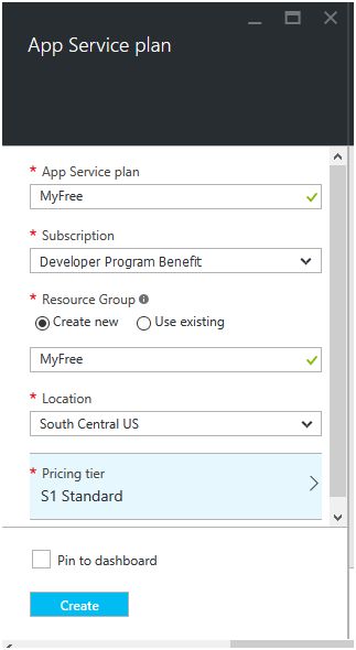 Click on “Select” in the “Choose your pricing tier” blade and then click on the “Create” button of the “App Service Tier” blade.