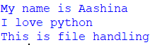 In the above example, we also closed the file using close() method, similar to open() method, close() method is used to close the file in the backend. We need to close the file because after closing it we cannot perform any read or write operation on it. Though python automatically closes the file so we don’t need to use this method but it is a good practice to do so.