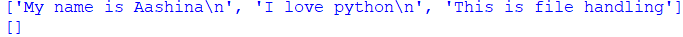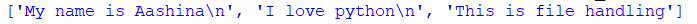 All the data inside your file will be printed in the form of list if we use method readlines(). So our sample file have 3 lines inside it, using readlines() method, will give us output as a list with 3 components in it, like-