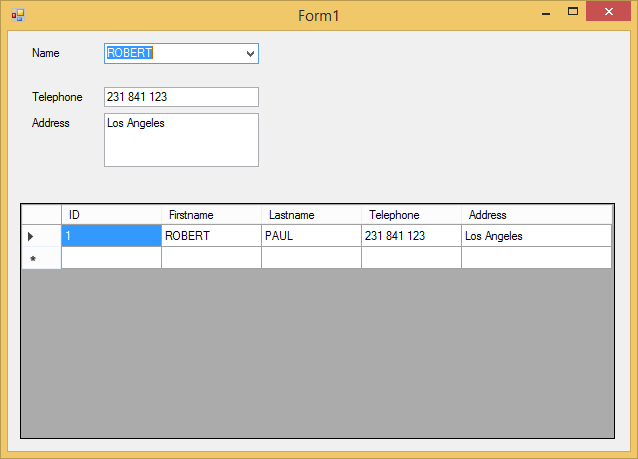-                     string query = "select id,firstname,lastname,telephone,address from user where firstname = '" + comboBox1.SelectedItem.ToString() + "'";