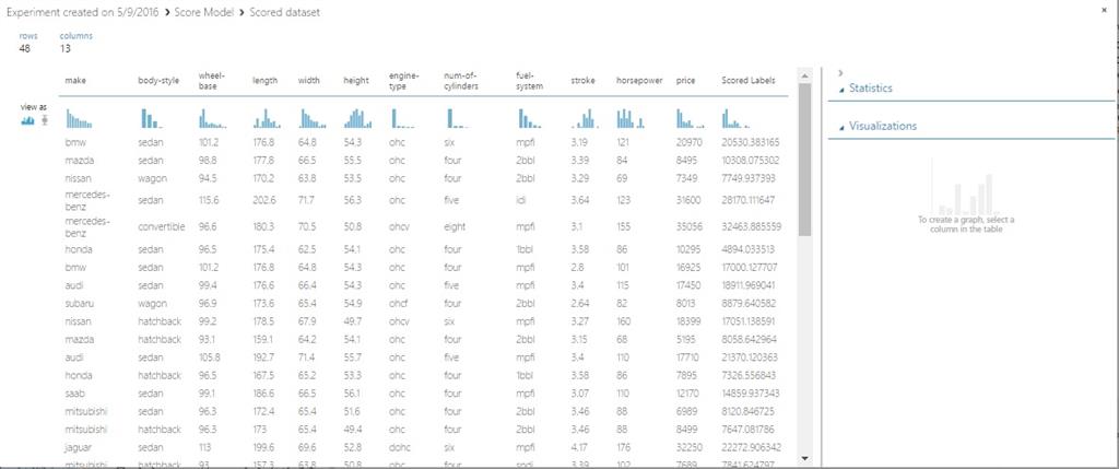 To run the experiment and view the output from the Score Model module, click the output port, and then select Visualize.
