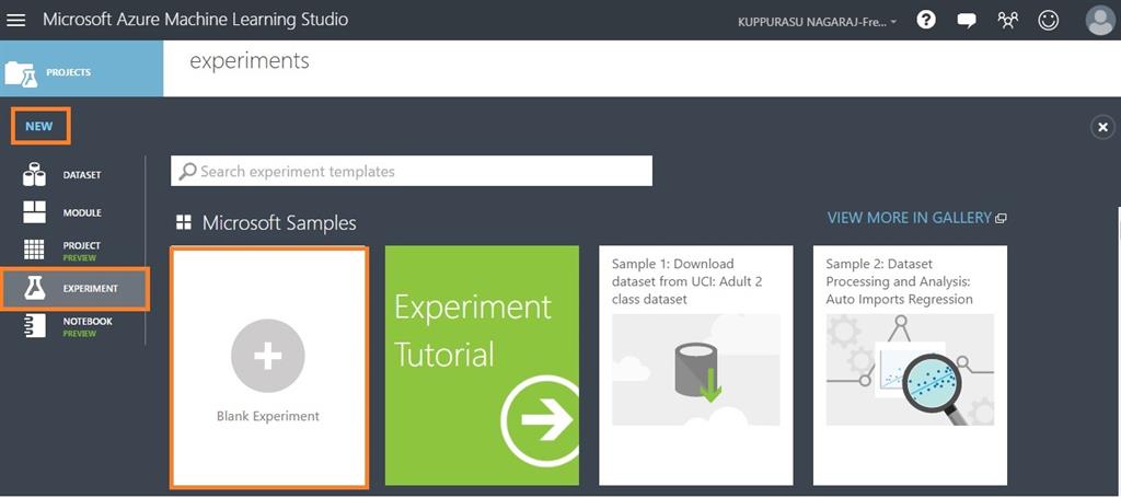 For creating a new experiment by clicking + NEW at the bottom of the Machine Learning Studio window, select EXPERIMENT, and then select Blank Experiment.