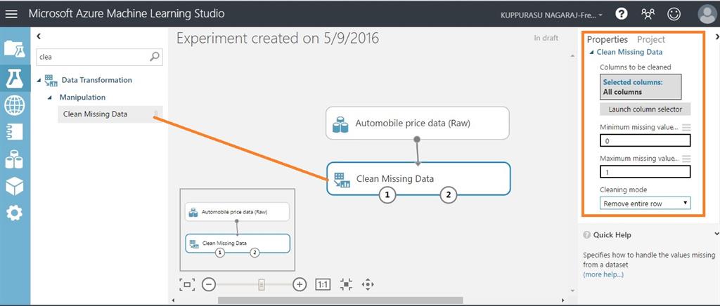 A dataset normally requires some pre-processing (Cleaning) before it can be analyzed. Drag the Clean Missing Data module to the experiment canvas and connect it to the Automobile Price data (Raw) module. In the Properties pane, select Remove entire row in Cleaning mode to clean the data by removing rows that have missing values.