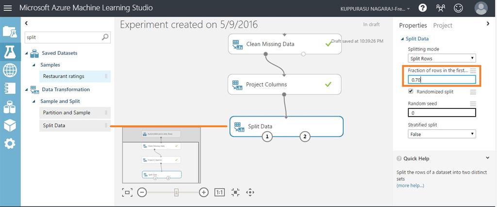 Next, add the Spilt Data module to the experiment canvas and connect it to the output of the last Project Columns module and set Fraction of rows in the first output dataset to 0.70.
