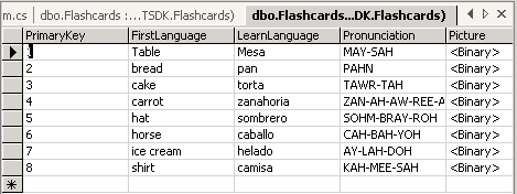 I thought it would be fun to write a simple program that displayed flashcards from a database and at the same time, show you how to read and write images to the database. This program is a simple flashcard program that talks to a single table in a Sql Server Database. The design of the database table is shown below:
