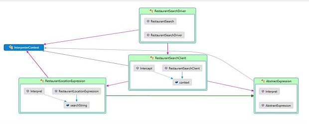 Below is the "Code Map" diagram of the restaurant search based on location using Interpreter Design Pattern,
