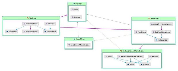 The Iterator Pattern provides a way to access elements of an aggregate object sequentially without exposing the underlying structure of the object. I have used this design pattern for the displaying of food menus based on the restaurant because different food items form a menu and the possibility of multiple traversals can be there and I don't want to expose its internal representation to the outside.