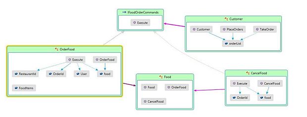 Command design pattern falls under behavioral design pattern. It wraps the request under an object that is called Command. That command object is being passed to invoker object. I have used this design pattern because user can order or cancel food menus for delivery. Two different kinds of requests can be done by the user for food ordering.