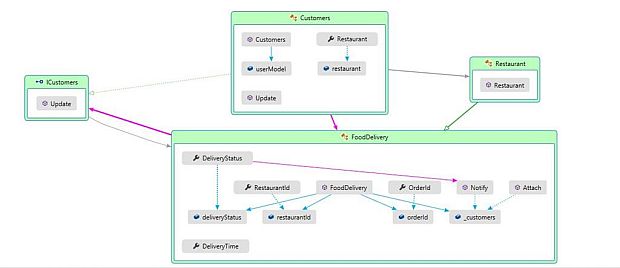 Below is the "Code Map" diagram of Track an Order in Real Time after Ordering Meal using Observer Design Pattern,