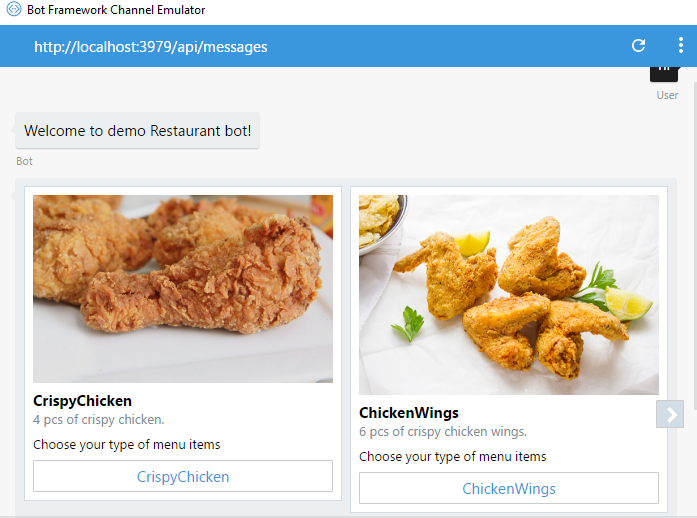 Another use case that may also be required when solving real-time business problems is the need to display Menu Items with some pictures and a description rather than just displaying their names. Something which is by default supported while we use Dialog, we can easily display Hero card in a carousel format. But what about this feature in FormFlow? Can we get the best of both worlds? The answer is yes. Microsoft Bot Framework has given us the flexibility to achieve that as well.