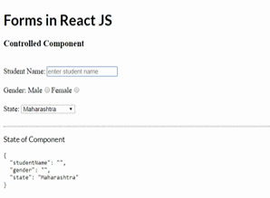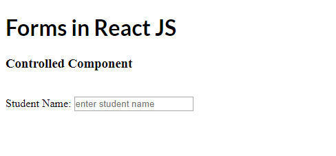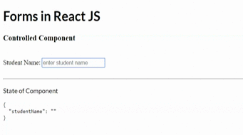 So we have created a state and added studentName as property. After that, we have created onChange handler which will change the state and bind it to onChange event of the input element and we also printed the state object to see the changes in component state.