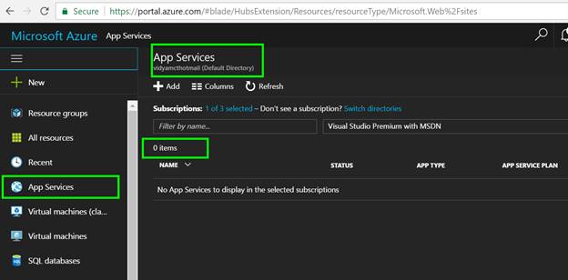 Click on App Services and you will see your App Services panel as shown below (you will see your services listed if you have any; which were created previously).