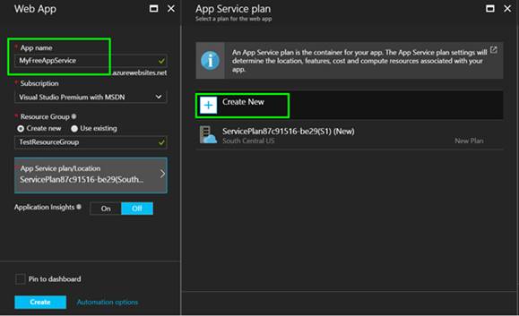 After filling in the details on the left pane, select “App Service plan/Location”, and from the right pane, select “Create New”. A new window will appear as shown below. Enter Name and choose location of Azure Data-center to host your app service, and select Pricing Tier.